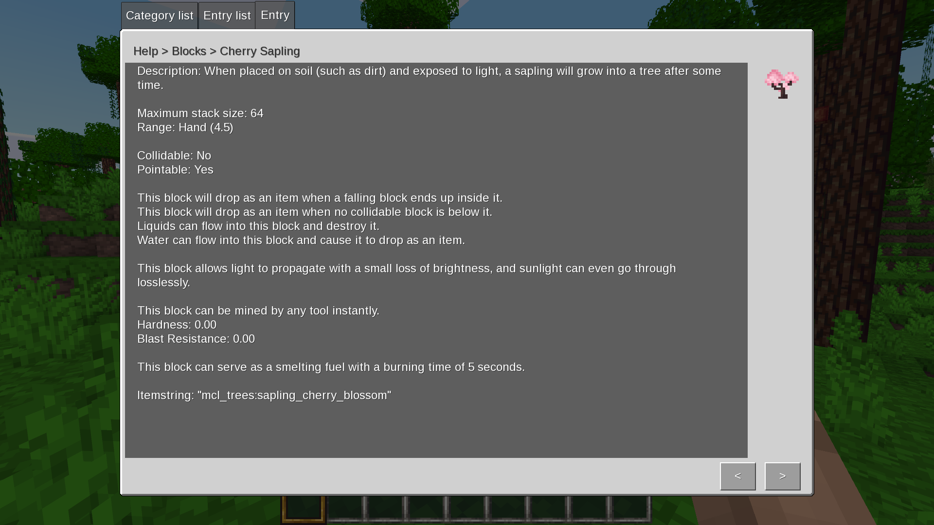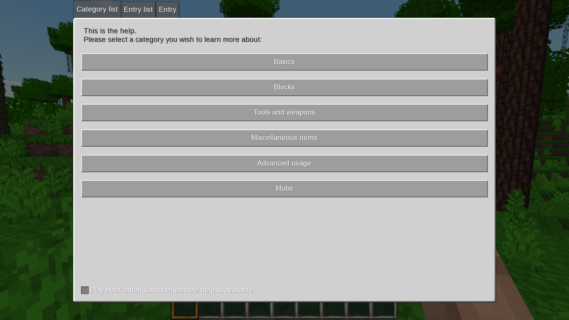 The Mineclonia help system evolved from similar in-game help projects for other Luanti games and was introduced during Wuzzy’s maintainership of MineClone 2, meaning that it’s available in all surviving MineClone games (including VoxeLibre).